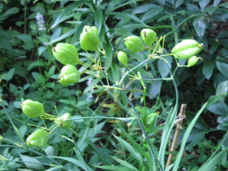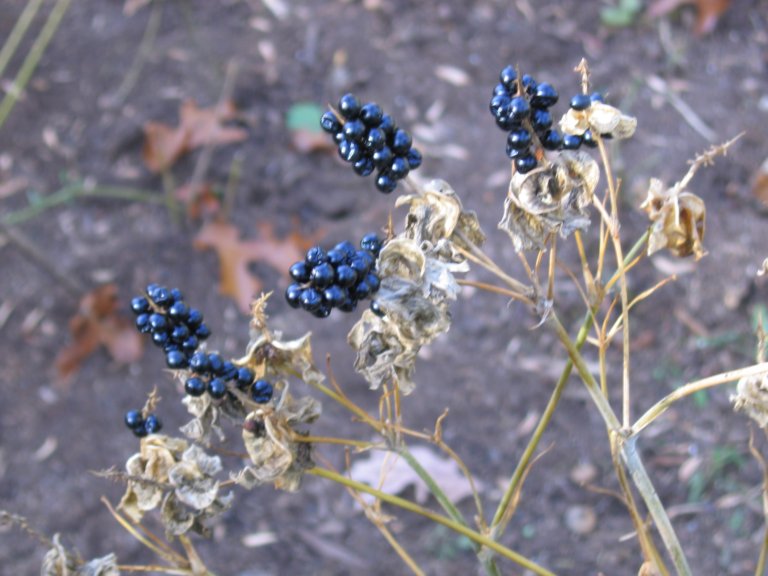 These lovely seedheads develop in autumn. The first picture shows the immature pods. The outside becomes brown and papery. They break open to reveal the luscious blackberry seedheads. Resist temptation: do not eat them. The seedheads persist into winter. They will drop and produce more plants the following spring.