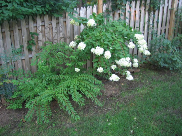The second picture shows what the plant looks like in the summer, on the lower left, beneath the Pee Gee hydrangea.