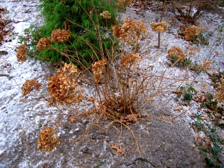 The distinctive white blooms of the Annabelle hydrangea turn green in the summer and brown in the fall. Even after the frost, as you see in this picture with the snow on the ground, they continue to hold some dried blooms that provide interest in winter. On my property, this hydrangea happily grows on a shady hill beneath white pines.