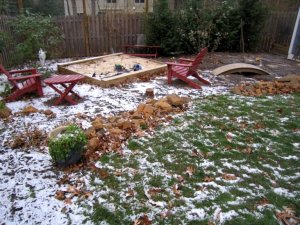 Once we finalized these lines, we decided to relocate all of the now visible rocks from the tree and lawn areas for the safety and comfort of running and walking barefoot. It was at this stage that we decided to make the “wall” that provided a name for the Walled Garden.