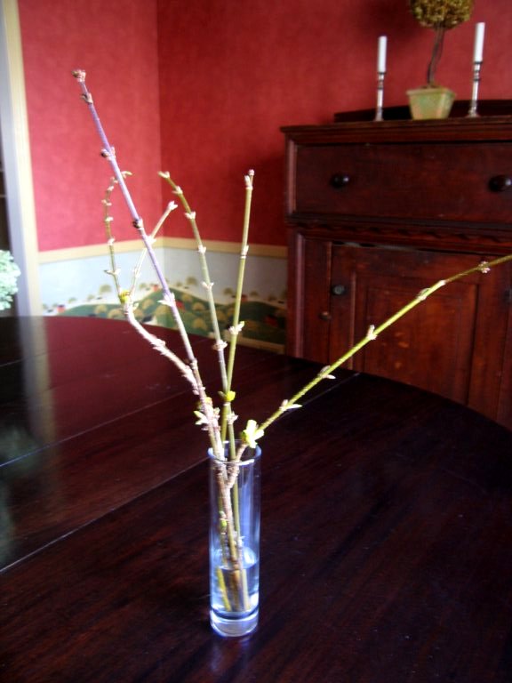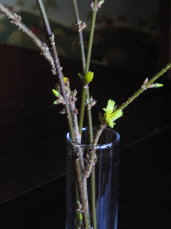 For a prior post and additional pictures on forcing forsythia and bulbs, click here: http://heirloomgardener.blogspot.com/2006/02/forcing-forsythia-and-bulbs-of-all.html