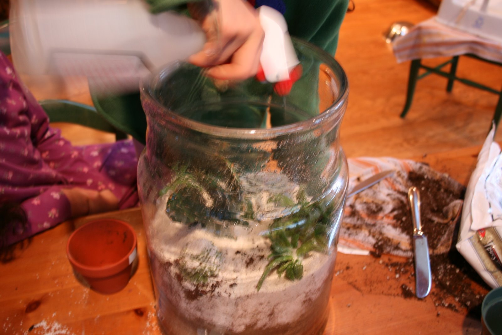 6. Spray the sand off the succulents and walls of the terrarium with the spray bottle.