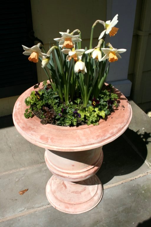 In the pot that is next to my front door (first picture), daffodils greet visitors. At the base of the daffodils, there is a ring of pansies and lettuce (see the detail in the second picture), an idea that I picked up from