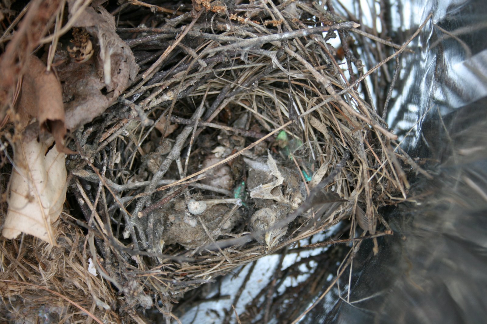 The tufted titmice win the contest for the most comfortable-looking nest. They made their nest mostly of leaves and fine grasses. They made this nest in the children’s fort. Interestingly, the nest was built vertically like a cave instead of horizontally like a cup (picture of a tufted titmouse nest).