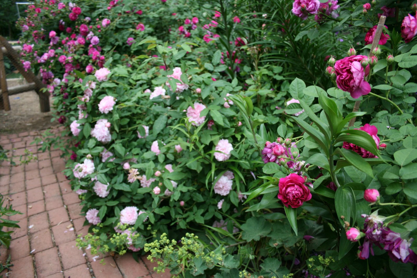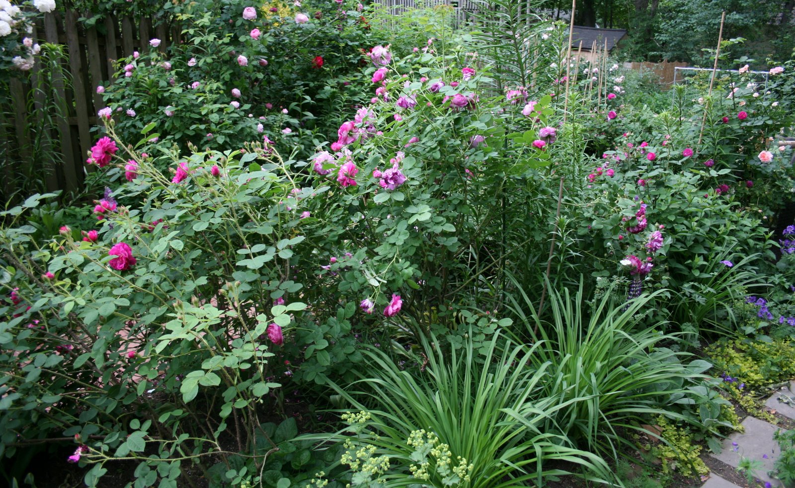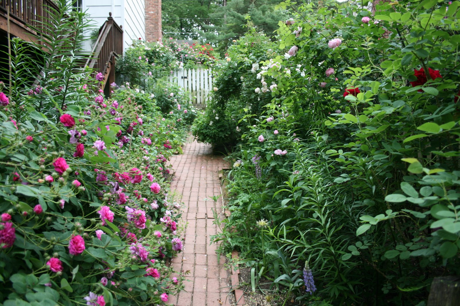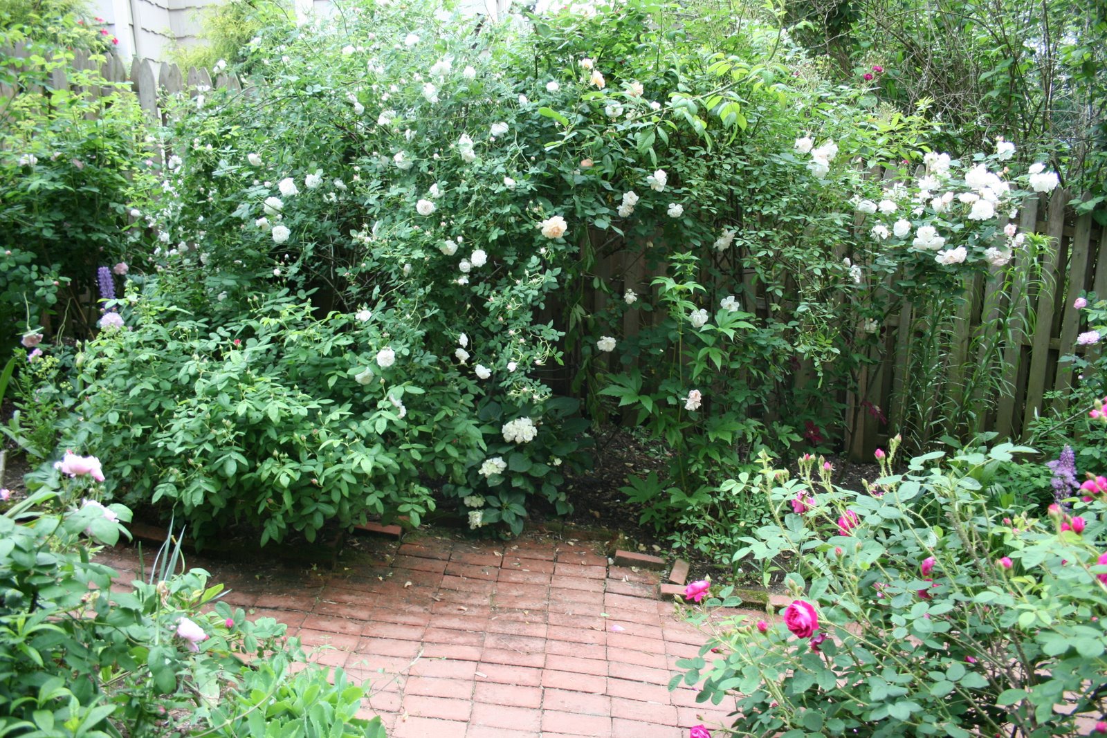 Can a home gardener have a rose garden? If you have ever asked yourself that question, my answer is an unequivocal yes. Inspired by the Cranford Rose Garden at the Brooklyn Botanical Garden, I knew that I could fit a lot of roses into a small space, which I have endeavored to do in this 15′ x 30′ strip of a sloped suburban backyard. In this post (Part I), I’ll take you on a short little walk up and down the brick path. In the next couple of days, I’ll endeavor to sort through the close-ups of the individual roses and try to post at least some of them.