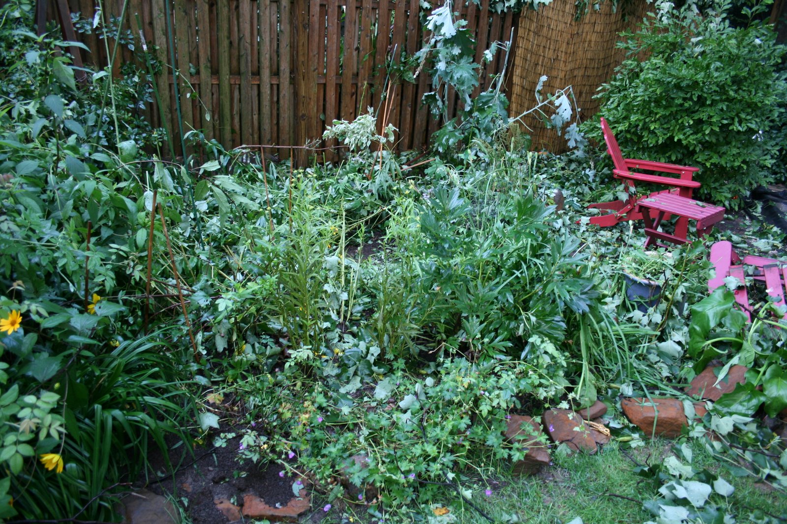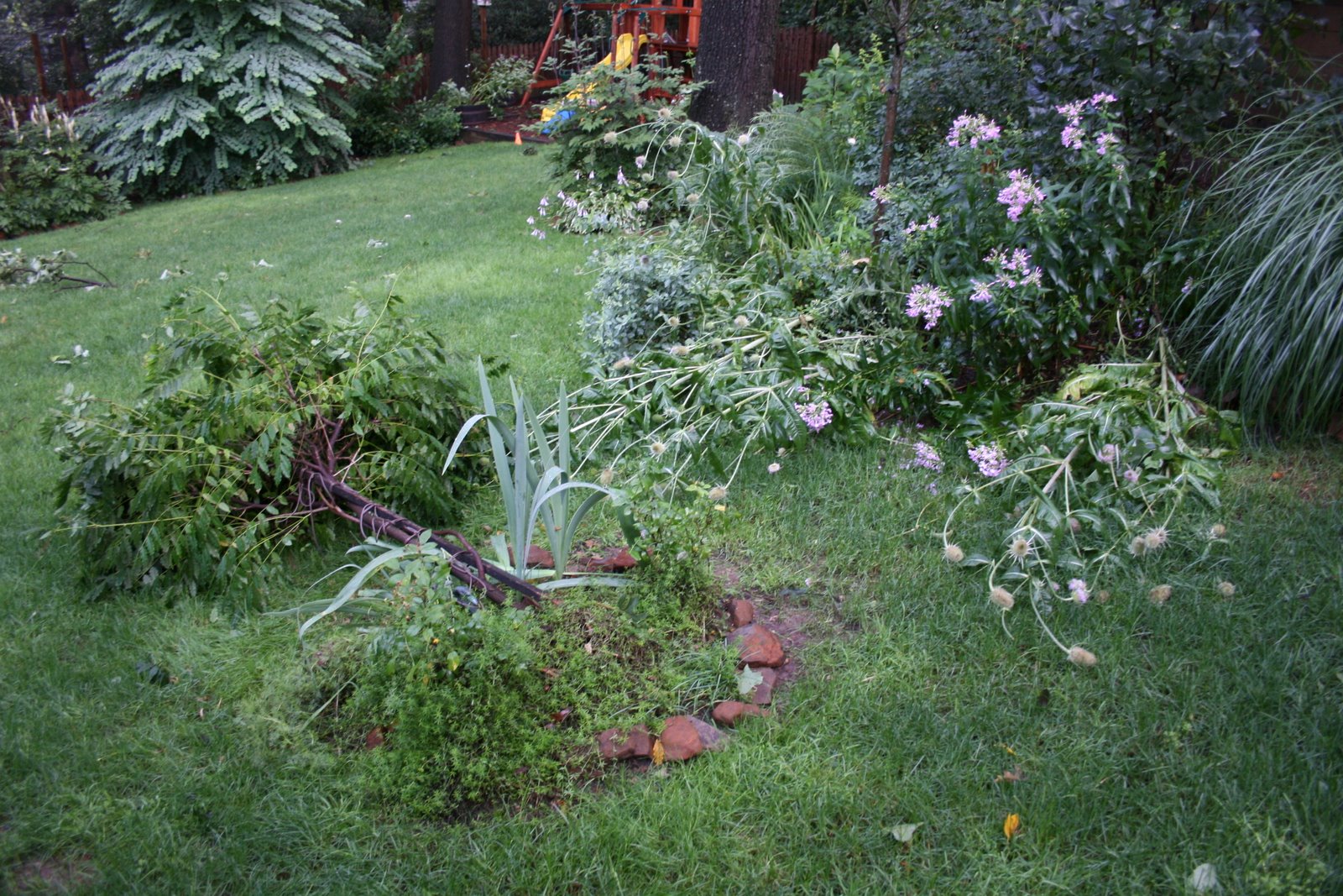 Yesterday around 5PM, it started to thunder. A few minutes later, the lightning started to flash. Torrential rain and hail the size of ice cubes followed. The rain was so forceful it was coming through the screens in the open windows. Next, lightning struck one of our neighbor’s trees and we saw a large branch fall into our yard, right into the Long Border and the Walled Garden. After several minutes, it all stopped and the sun began to shine. Then, in our front yard, very low to the ground, there it was–a bright rainbow. We walked out to survey the damage to the garden. Many of the tall plants throughout the garden were laying on the ground, but most of the real damage, as you can see below, was limited to the Long Border.